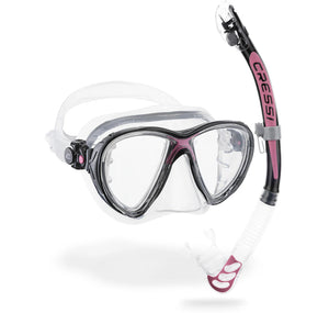 The Cressi Big Eyes Evolution provides improved visibility, reducing weight to 160g and its internal volume to 115 cm³, which are typically found with much smaller masks. Featuring an Evo skirt with two different densities of silicone, the mask offers dynamic stability, comfort, and a perfect fit on the face. The interior part composed of rigid silicone brings solidity and stability, and the exterior part made of very soft reinforced silicone with increased thicknesses in key areas (especially on the sides) and the contact area with the frame provides unmatched comfort. The exterior skirt around the face and nose has a decreasing thickness that enhances adaptation and maintains comfort during long-term use. Additionally, the buckles are fully pivoting in all directions and connected to the frame using a flexible and unbreakable elastomer, and the lenses are set at a 15º angle for extended, superior visibility.